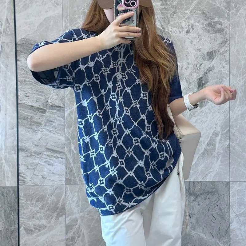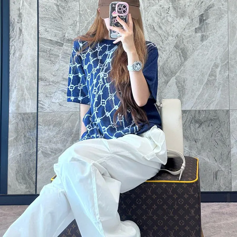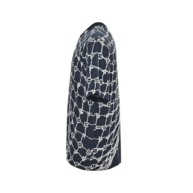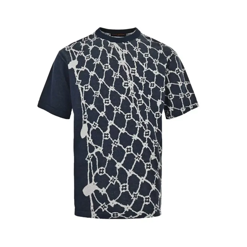 今コレクションの海のテーマから着想を得た、ネイビーブルーのコットンショートスリーブクルーネック。波打つ水面を想わせる不規則なモチーフが特徴のモノグラム・フィッシュネット ジャカードを、コントラストを描くホワイトで全面にあしらいました。カジュアルなパンツやショーツにグラフィカルなひねりを加える夏らしいアイテムです。