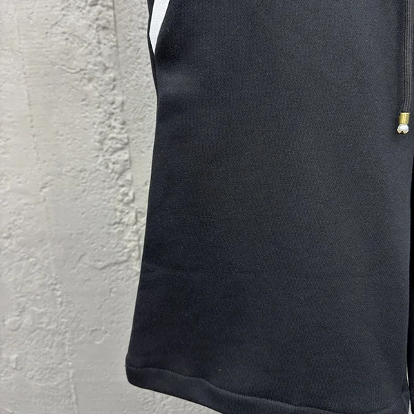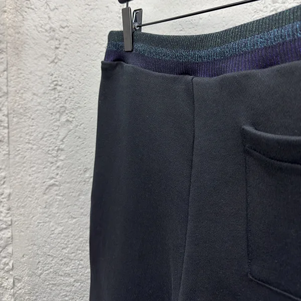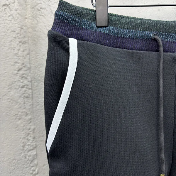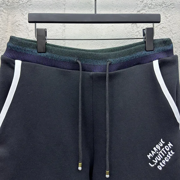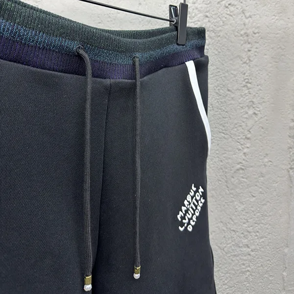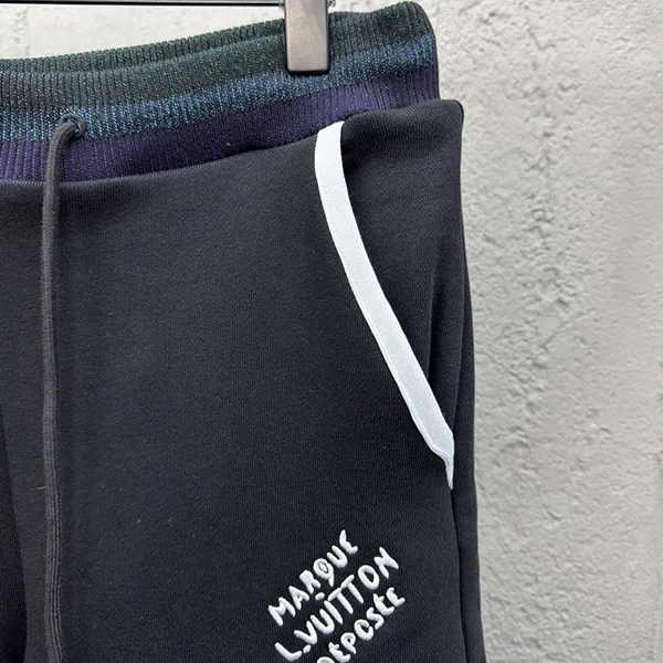 ブラックのコットンジャージーに、ウエストのブルーグリーンのグラデーションリブがアクセント。左脚には「Marque L. Vuitton Deposee」の刺繍シグネチャーを施し、ホワイトのパイピングポケットが洗練された印象をプラス。セットアップで着用できるバーシティジャケットも展開。