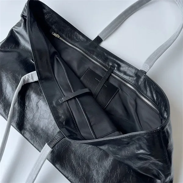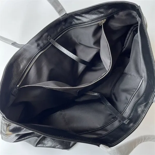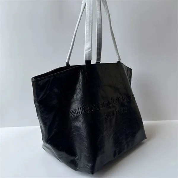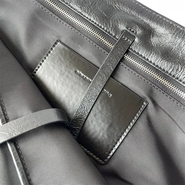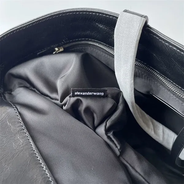 使い込まれたような外観と質感を与える、ひび割れ模様パテントレザーを使用したラージサイズのレザーバッグ / フロント中央に同系色の立体的な「alexander wang」ロゴ /内側のバックウォールポケットはノートパソコンが入るサイズ / 大型トップハンドル2本 / 内側上部にタイ開閉。