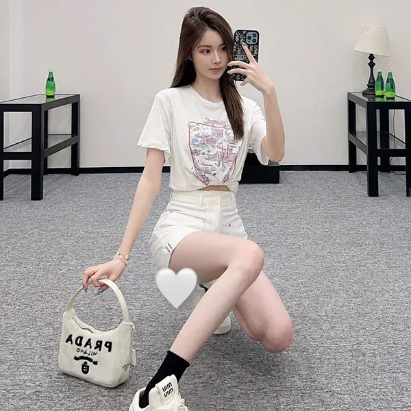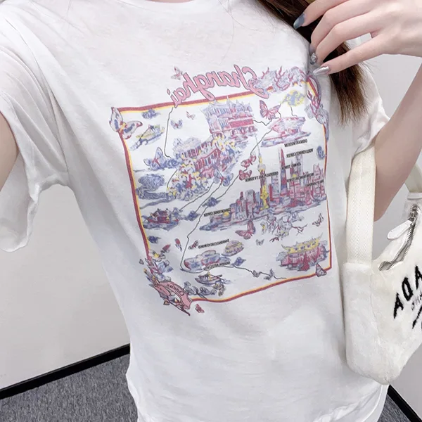 白地のベーシックなクルーネックTシャツに、上海のランドマークや街並みを描いたイラストが大胆にプリントされたデザイン。