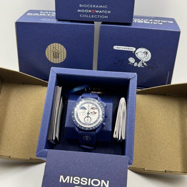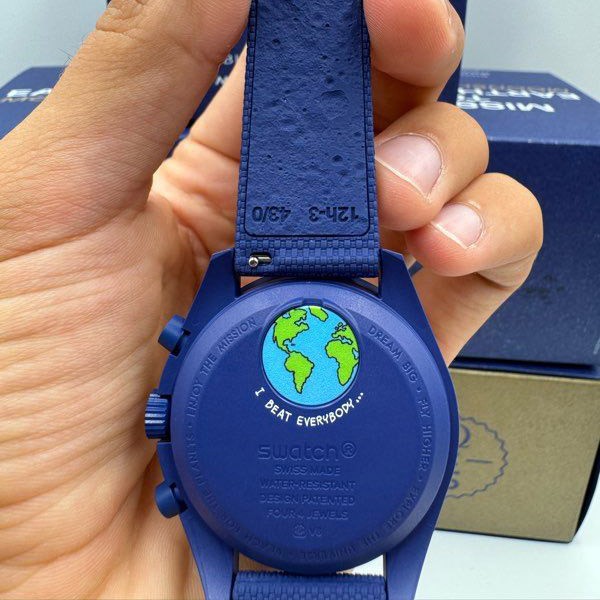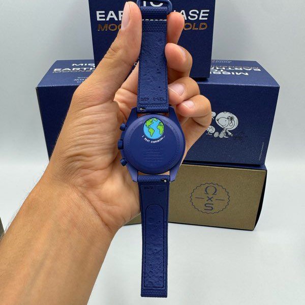 バッテリーカバーには地球にインスパイアされたデザインが施され、ネイビーのラバーストラップとVELCRO®クロージャーが宇宙飛行士風のクールな感じを添えています。このコレクションのすべての時計の文字盤には、オメガ X Swatchの文字、アイコニックなSpeedmasterのロゴ、そしてMoonSwatchのロゴが見られます。またボックス型バイオ由来素材グラス構造、グラス中央にはSwatchのロゴを参照した「S」のエッチング加工、文字盤の外側のリングとへこんだサブダイヤルには繊細で洗練された円の模様、シャープでスムーズなラグ構造、そしてもちろんユニークなBioceramicのタッチ。これらが全モデルに共通です。アワーマーカー、時針と分針、クロノグラフ秒針の先端は、Grade A Super-LumiNova®でコーティングされ、暗闇で完璧に光ります(グリーンの発光)。