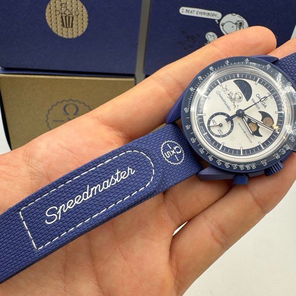 このクロノグラフはネイビーBioceramicのケースとクラウン、プッシャー、そしてお揃いのネイビーのラバーストラップとBioceramicループの組み合わせが特徴で、ホワイトオパーリンの文字盤にはGrade A Super-LumiNova®(グリーンの発光)でコーティングしたアワーマーカーが付いています。10時位置のアースフェイズ表示は地球とともに、UVライトに当たるとブルーに発光する海を示しています。アースフェイズ表示の下には、月面にいるSnoopyとWoodstockが地球の魅惑的な光景に驚嘆しているイラストが描かれています。このイラストには、UVライトが当たるときしか現れないフレーズが隠されています。2時位置のサブダイヤルにあるムーンフェイズ表示には、OMEGAのMoonshine™ Goldでコーティングされた2つの輝く満月が描かれています。一方の月はSnoopyワールドの独特のスタイルでデザインされていて、もう一方は意外なポップコーンのデザインでリメイクされています。