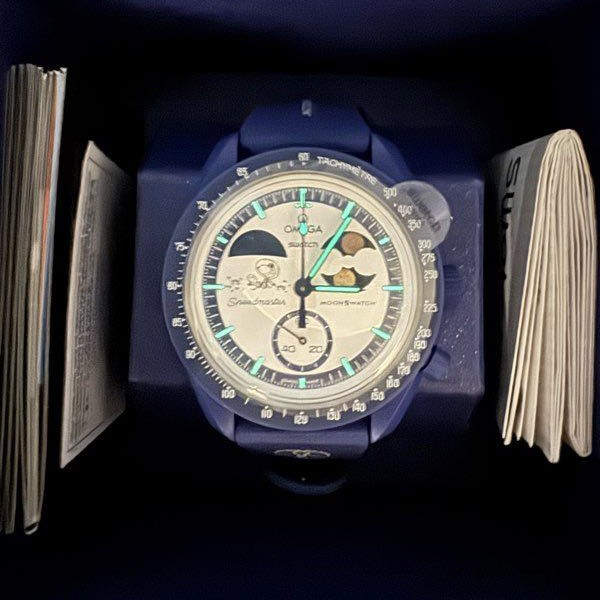 このクロノグラフはネイビーBioceramicのケースとクラウン、プッシャー、そしてお揃いのネイビーのラバーストラップとBioceramicループの組み合わせが特徴で、ホワイトオパーリンの文字盤にはGrade A Super-LumiNova®(グリーンの発光)でコーティングしたアワーマーカーが付いています。10時位置のアースフェイズ表示は地球とともに、UVライトに当たるとブルーに発光する海を示しています。アースフェイズ表示の下には、月面にいるSnoopyとWoodstockが地球の魅惑的な光景に驚嘆しているイラストが描かれています。このイラストには、UVライトが当たるときしか現れないフレーズが隠されています。2時位置のサブダイヤルにあるムーンフェイズ表示には、OMEGAのMoonshine™ Goldでコーティングされた2つの輝く満月が描かれています。一方の月はSnoopyワールドの独特のスタイルでデザインされていて、もう一方は意外なポップコーンのデザインでリメイクされています。