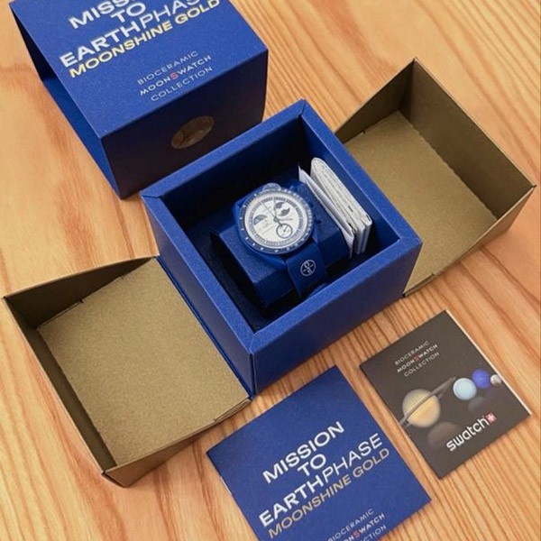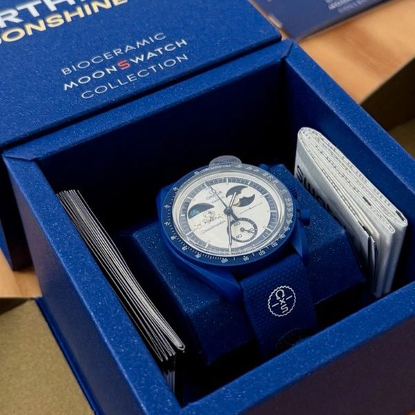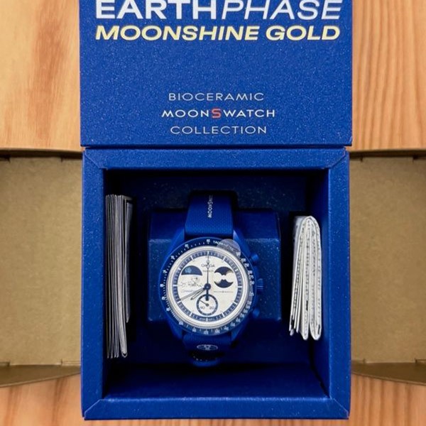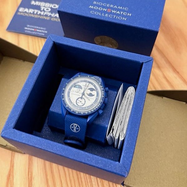 バッテリーカバーには地球にインスパイアされたデザインが施され、ネイビーのラバーストラップとVELCRO®クロージャーが宇宙飛行士風のクールな感じを添えています。このコレクションのすべての時計の文字盤には、オメガ X Swatchの文字、アイコニックなSpeedmasterのロゴ、そしてMoonSwatchのロゴが見られます。またボックス型バイオ由来素材グラス構造、グラス中央にはSwatchのロゴを参照した「S」のエッチング加工、文字盤の外側のリングとへこんだサブダイヤルには繊細で洗練された円の模様、シャープでスムーズなラグ構造、そしてもちろんユニークなBioceramicのタッチ。これらが全モデルに共通です。アワーマーカー、時針と分針、クロノグラフ秒針の先端は、Grade A Super-LumiNova®でコーティングされ、暗闇で完璧に光ります(グリーンの発光)。